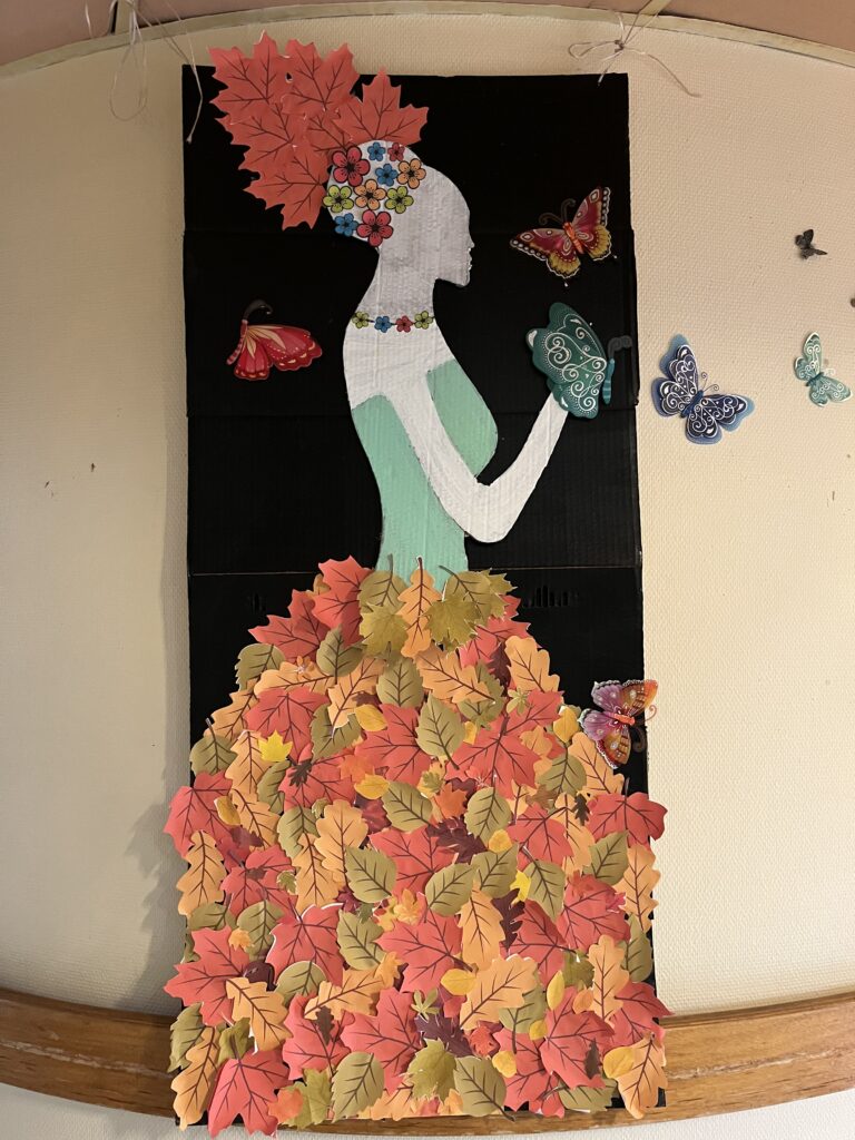 À partir du patron d’une silhouette féminine, chacun a participé à la création d’une magnifique robe entièrement composée de feuilles d’automne collées par les résidents. Feuilles rousses, jaunes, orangées… toutes ont trouvé leur place pour donner vie à une tenue unique, à la fois artistique et pleine de charme.