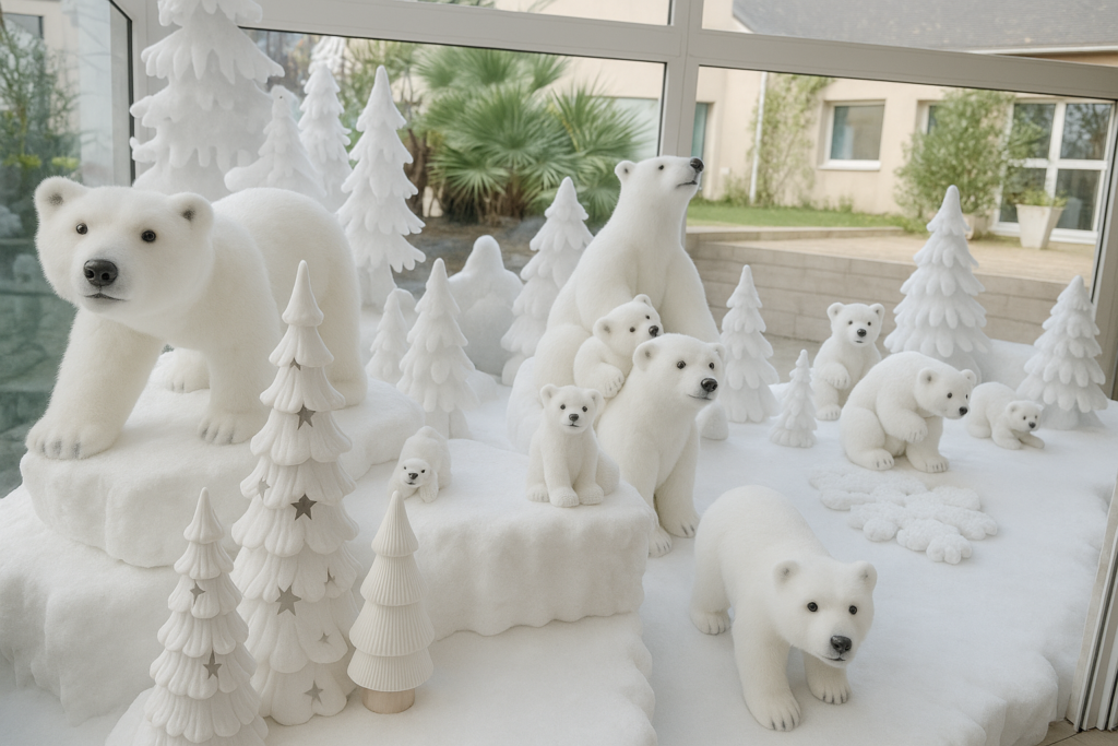 Dans le patio, une famille de pingouins et d’ours fraîchement débarqués du pôle Nord ont pris place pour le plus grand plaisir des résidents et de leurs familles. Ces personnages, devenus de véritables compagnons de promenade et de contemplation, apportent une touche de poésie, de sourire et de rêve à cette ambiance de fêtes.